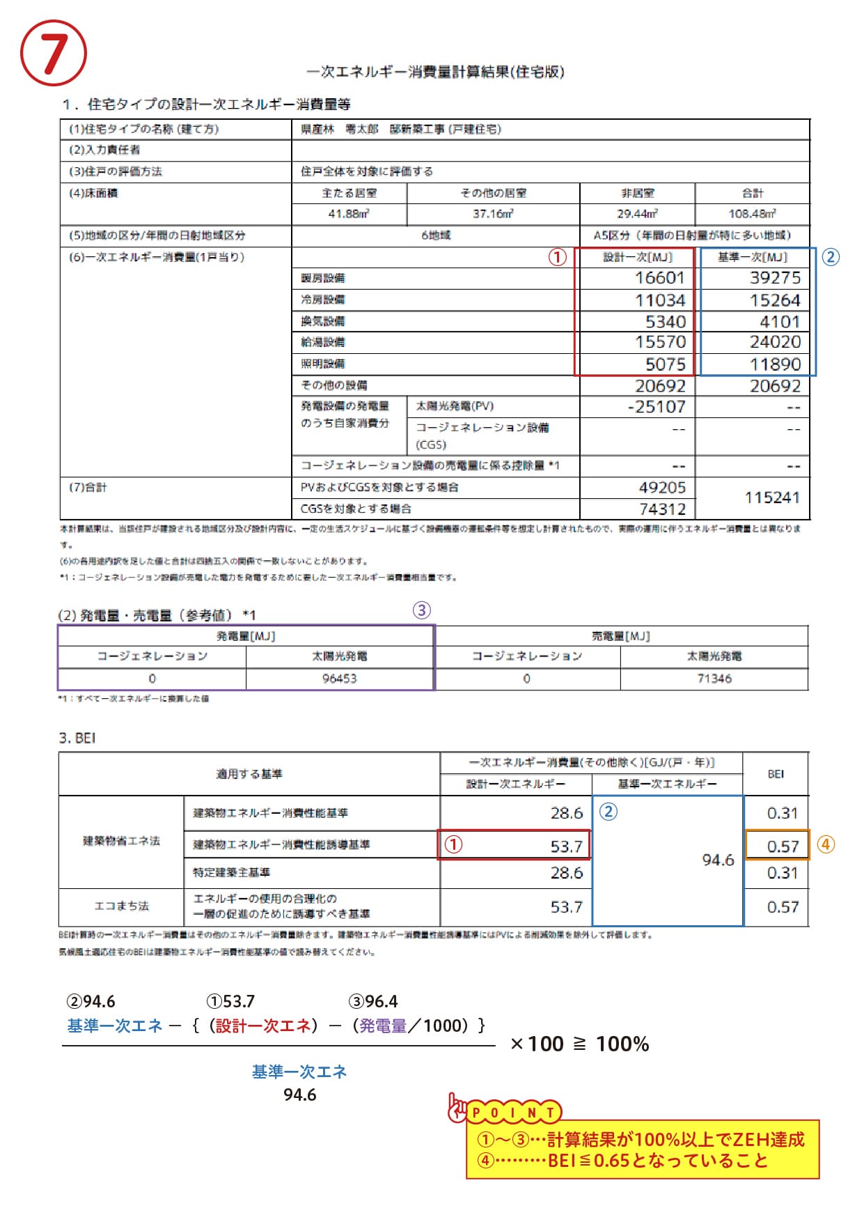 ⑦一次エネルギー消費量の削減率が確認できる書類(⼀次エネルギー消費量計算結果/帳票の場合の参考例)