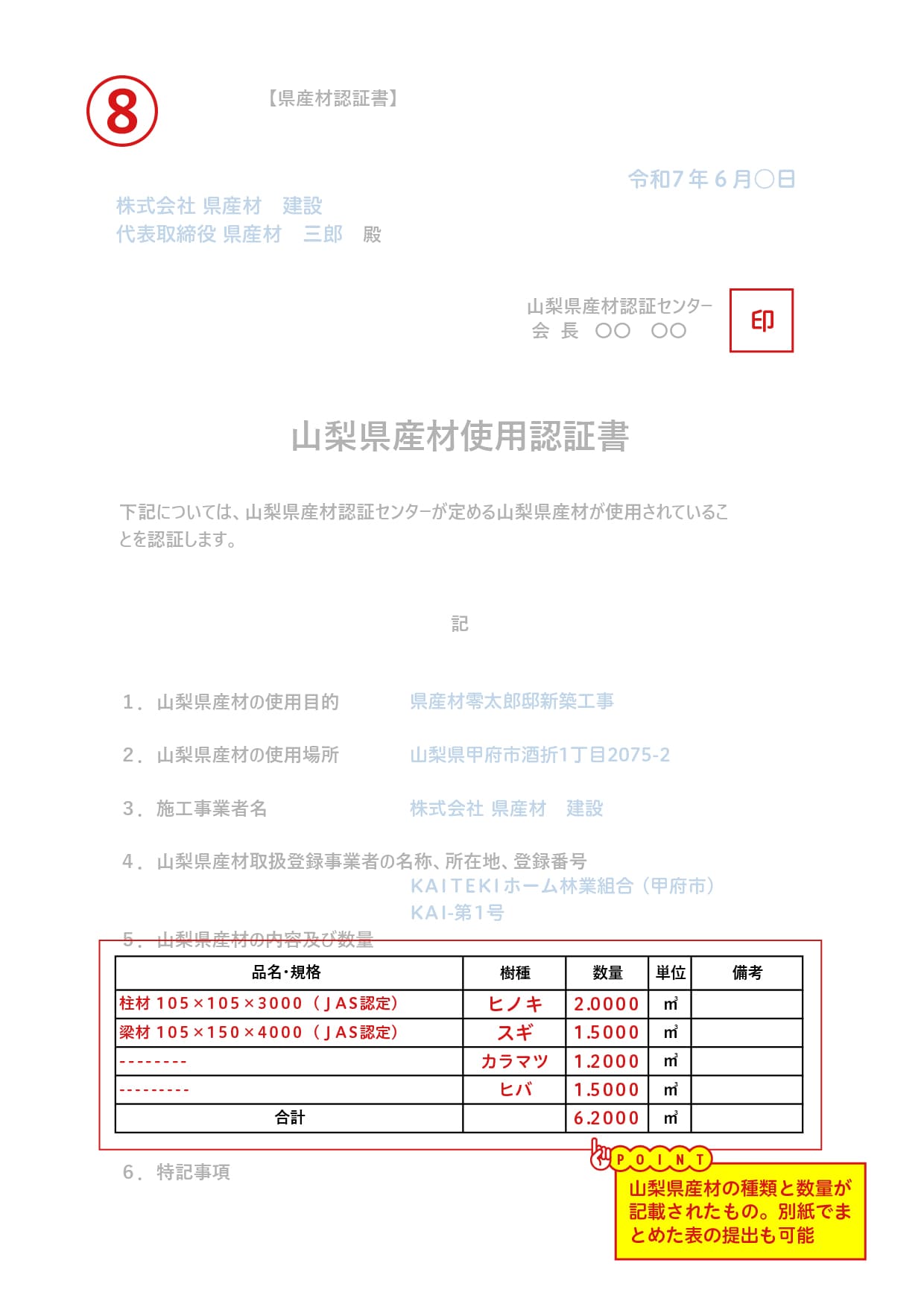 ⑧山梨県産材使用認証書(参考例)