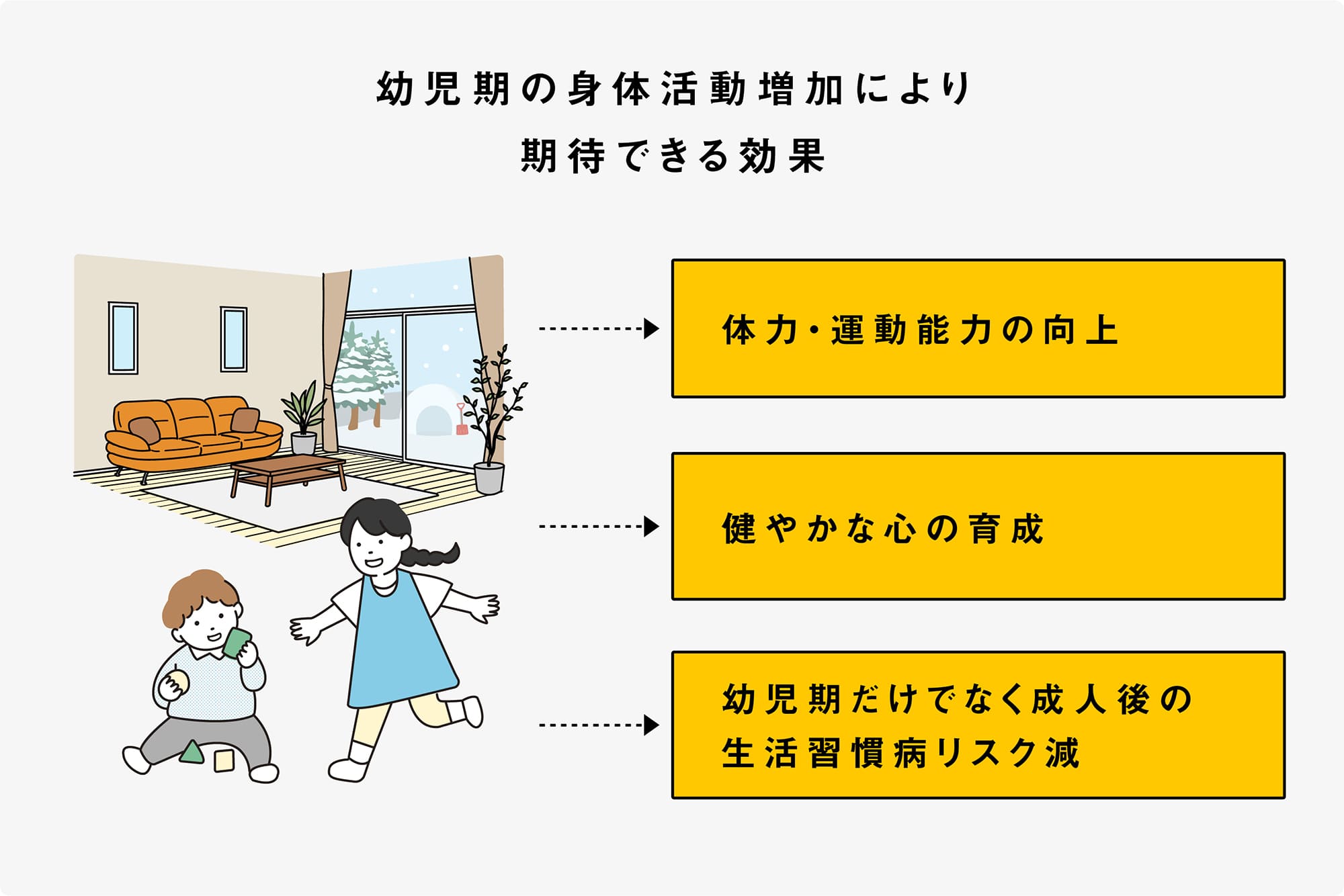 寒さや暑さによるストレスが減ることで身体活動が増加し、身体面では体力や運動能力の向上、そして身体の諸機能における発達が促されることにより幼少期だけでなく成人後の生活習慣病リスクを減らす効果も期待でき、長期的な健康づくりに寄与します。また、幼児期に思い切り伸び伸びと動くことで健やかな心の育ちを促す効果もあります。