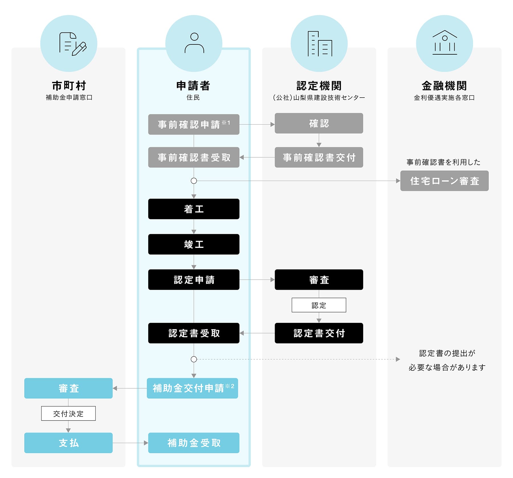 - 補助金の受給を予定している場合は必ず事前確認申請を行ってください。なお、事前確認申請は着工後に行うことも可能ですが、予算執行の円滑化のため可能な限り早期に申請願います。また、金融機関等における「やまなしKAITEKI住宅」に係る住宅ローンの金利優遇等を利用する場合には、事前確認書が必要となります。
