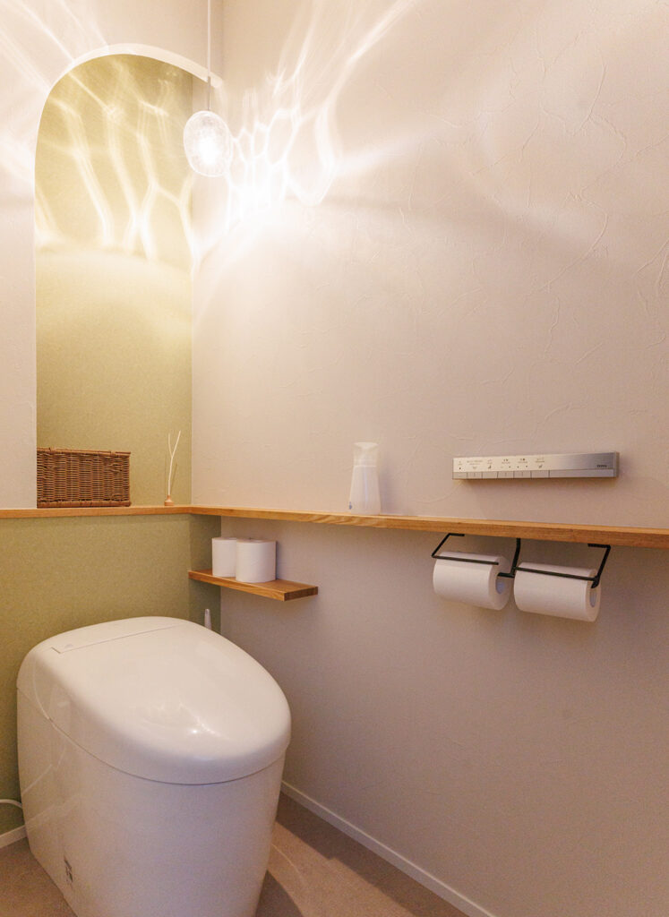 :間取りや造作も、納得がいくまで修正をお願いしました。自由設計で微調整が可能だからこそ、冷蔵庫の配置を考えて壁を数センチ下げてもらうなど、細かいこだわりを形にしていったんです。食器棚の一部は飾り棚にしてもらいました。特にトイレはSNSで調べたアーチ状の壁や棚を造作で再現してもらい、照明も自分で探してこだわり抜いた理想の空間でとても気に入っています。大手ハウスメーカーさんでは難しいような柔軟な対応をしてもらえたのが、地元の工務店で注文住宅を建てる良さだと思います。