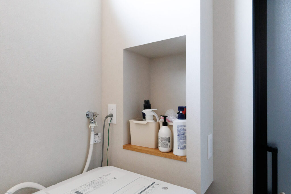 :ランドリースペースにあるニッチ(あえて壁をくぼませて作り出した収納スペース)は提案していただいたものですが、これも助かっています。基本的には僕は掃除担当なので「排水溝の手入れがしやすいように」という要望を出したところ、それに合わせて洗濯機の位置を調整していただきました。使いやすさはもちろん、手入れのしやすさまで考慮してもらえたのはオーダーメイドならではですね。