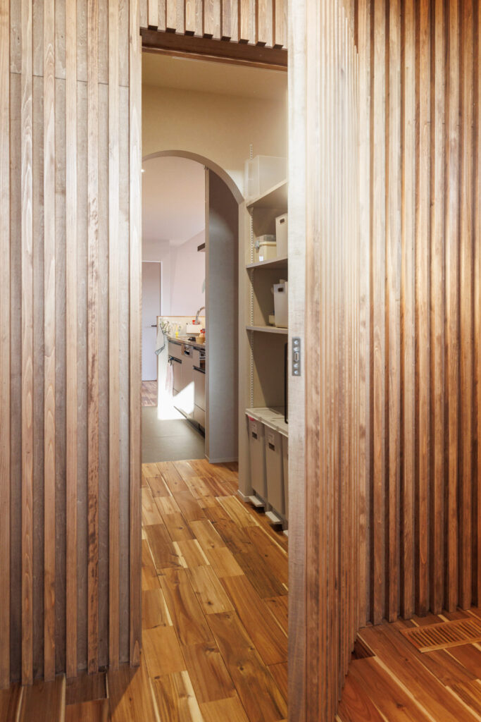 : 家事動線には徹底的にこだわりました。実は、玄関の格子状の壁は隠し扉になっているんです。そこを開けるとパントリーへ直結していて、重い買い物をした際もリビングを通らずにそのまま収納できるので楽ですね。また、家族と来客で動線を分けたのもポイントです。家族は玄関からファミリークローゼットを通ってそのままランドリールームへ行けるようにしたので、保育園の荷物や外の汚れをリビングに持ち込まず、その場ですぐに洗って着替えられます。家の中に汚れが広がらないのが本当に便利です。